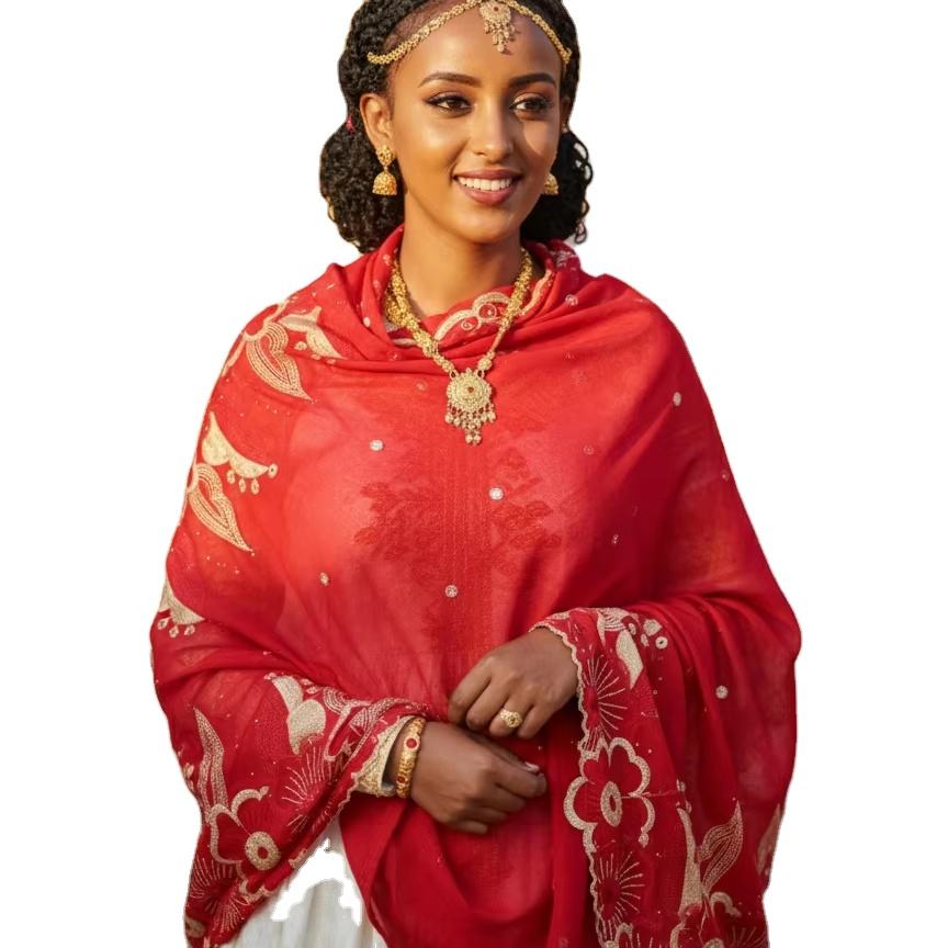 Red African Wholesale Chiffon Cotton Voile Lace Rhinestone Floral Scarf Dubai Style 2.2m Islamic Shawl Women Patterned Hijab