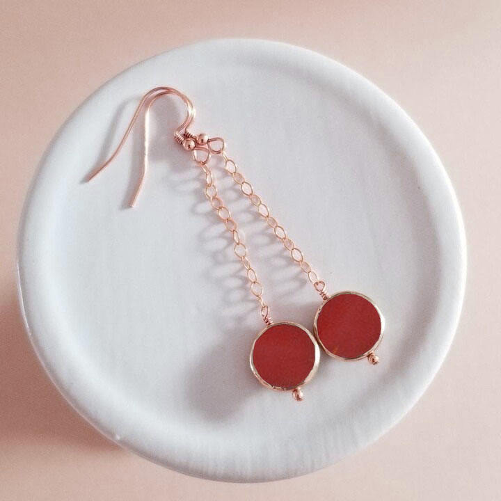 Red Agate Coin Shape Dangle Earrings Deep Red Natural Gemstone Rose Gold Plated Handmade Jewelry for Women
