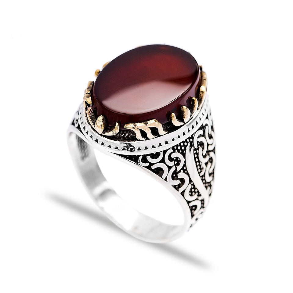 Red Agate Oval Shape Gemstone Authentic Men Ring Turkish Wholesale Handmade 925 Sterling Silver for Men
