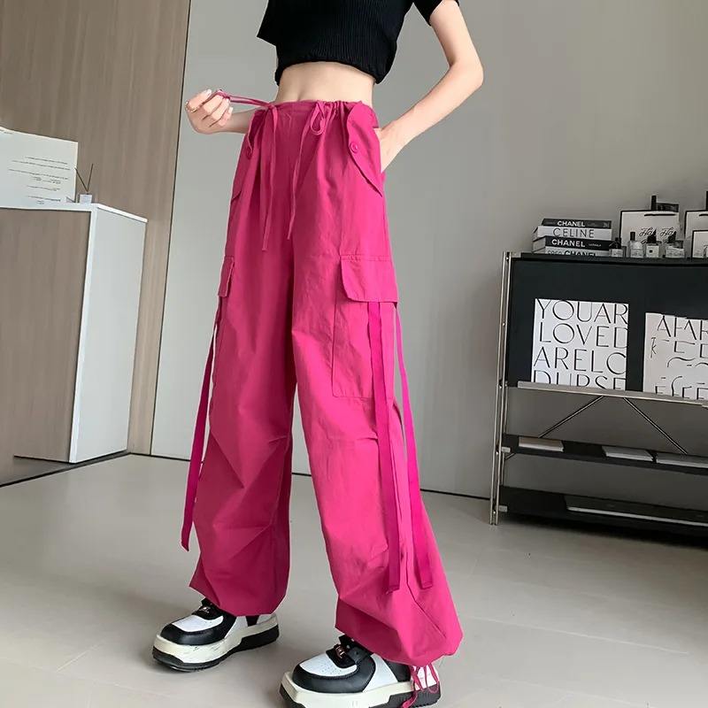 Red Cargo Pants Women Retro Casual High Waist Loose Female Hip Hop Trousers Punk Pants Funny Capri Pockets Pant Femme Streetwear