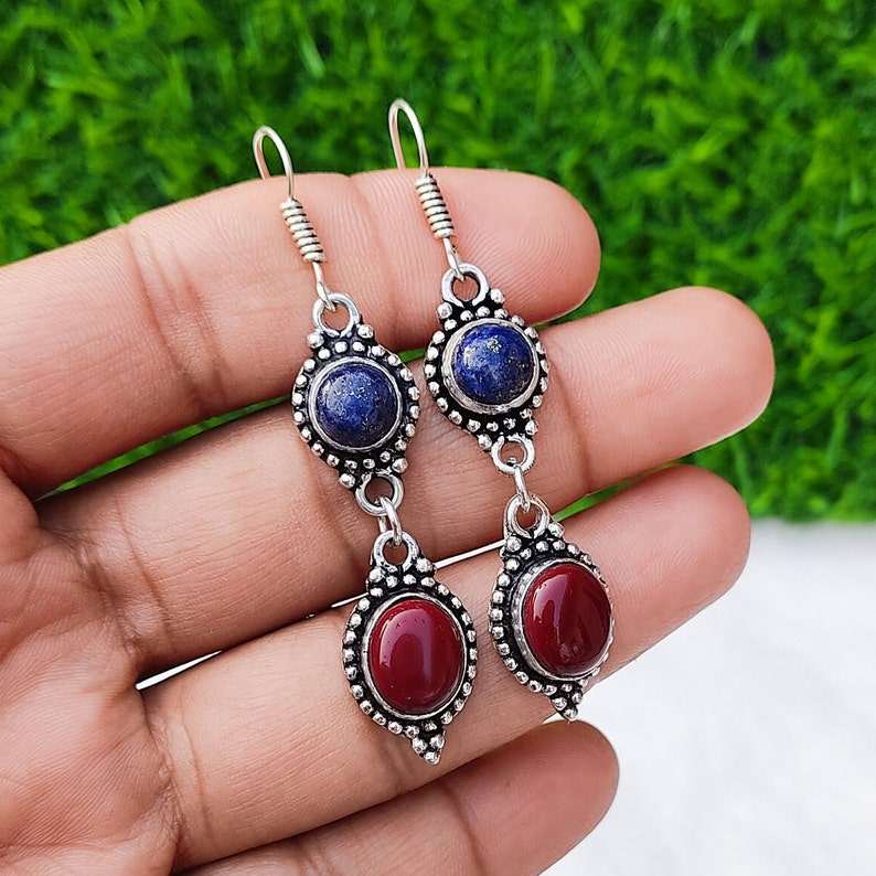 Red Coral And Lapis Lazuli Multi Stone Earrings Silver Plated Ear Wire Crystal Earrings Handmade Boho Jewelry Colorful Gemstone