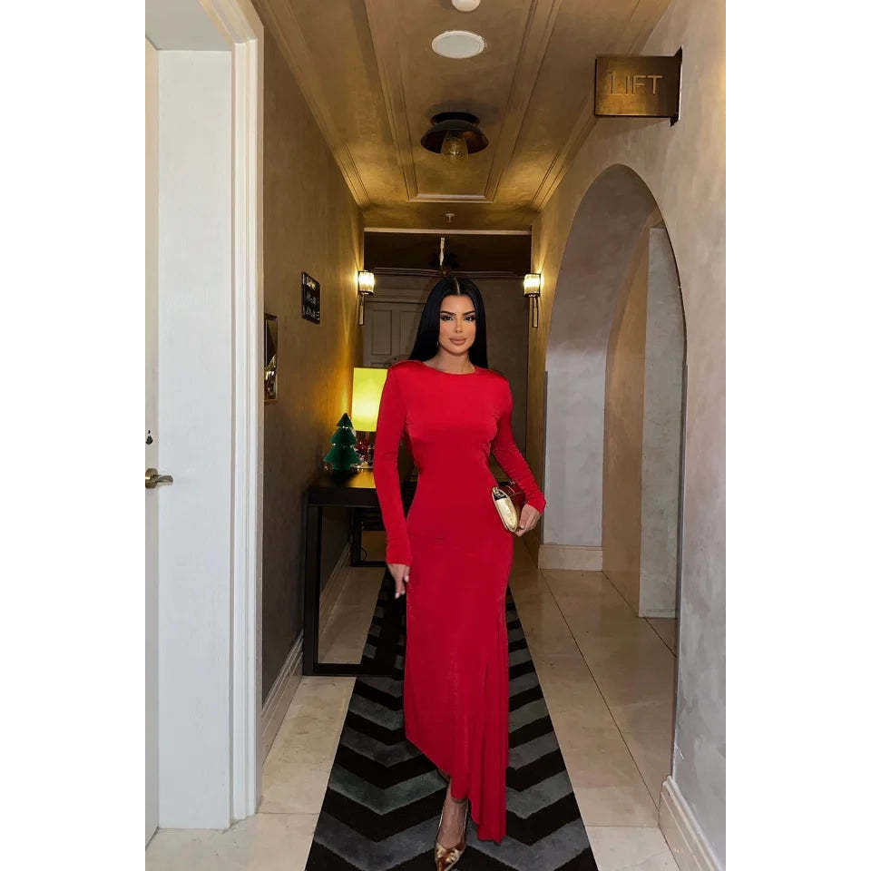 Monella Brown Midi Dress with Detailed Stone Long Sleeve Evening Gown