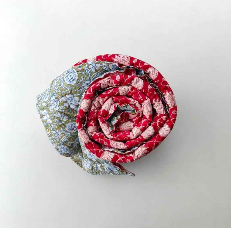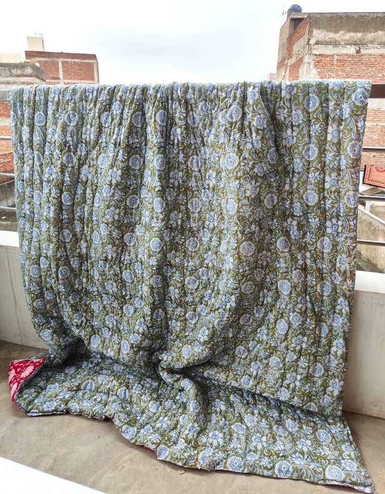 Red Floral Hand Block Print Organic Cotton Quilt Reversible Indian Razai Blanket