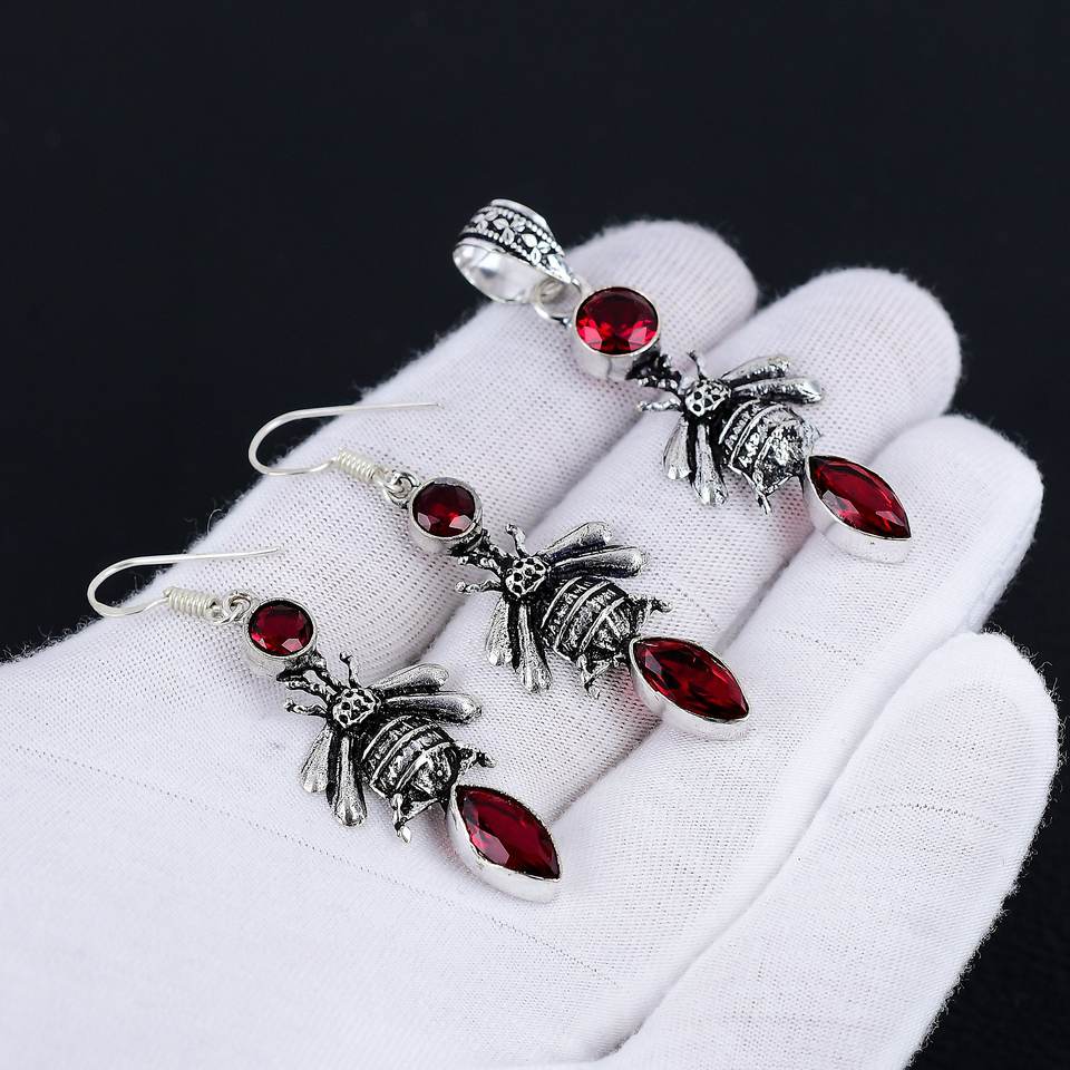 925 Sterling Silver Classic Style Bezel Setting Pendant Earrings Set Red Garnet Gemstone Handmade Pear Shape Perfect Christmas