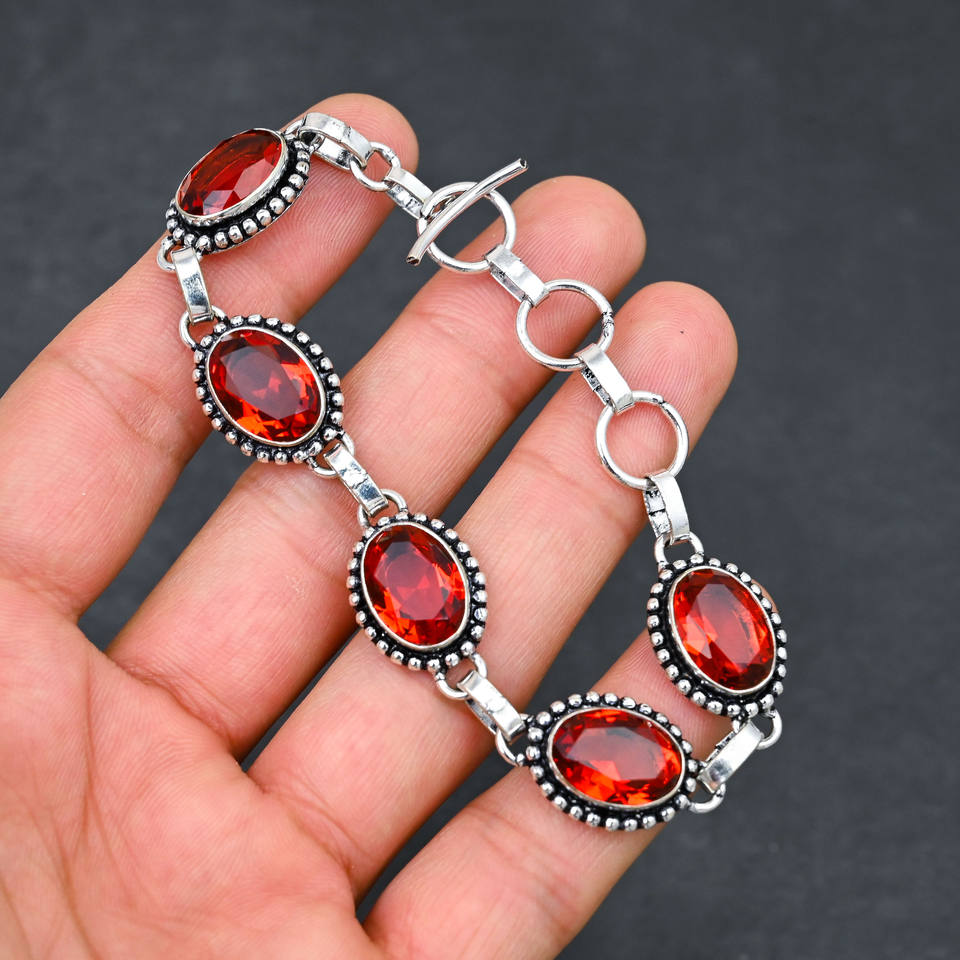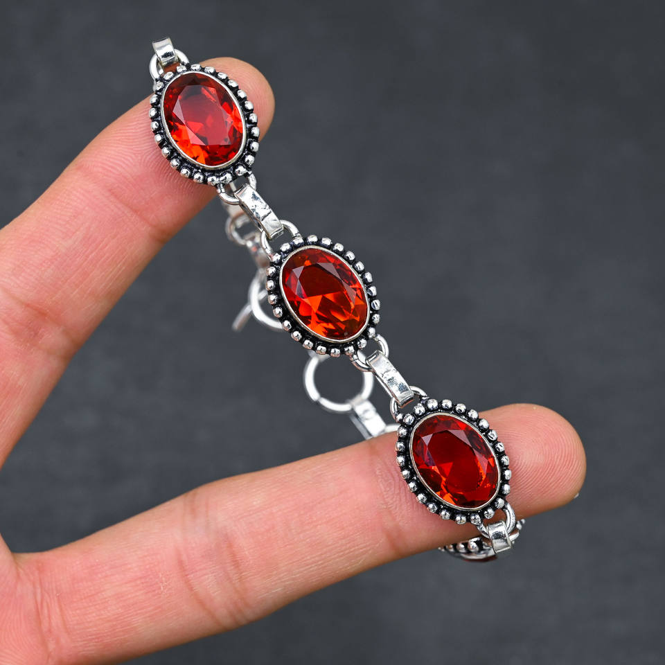 Red Garnet Lab Diamond Lab Created Luxury Unisex Bracelet Sterling Silver Silver Plated 10X14 MM Oval Cut 5 Stone Adjustable
