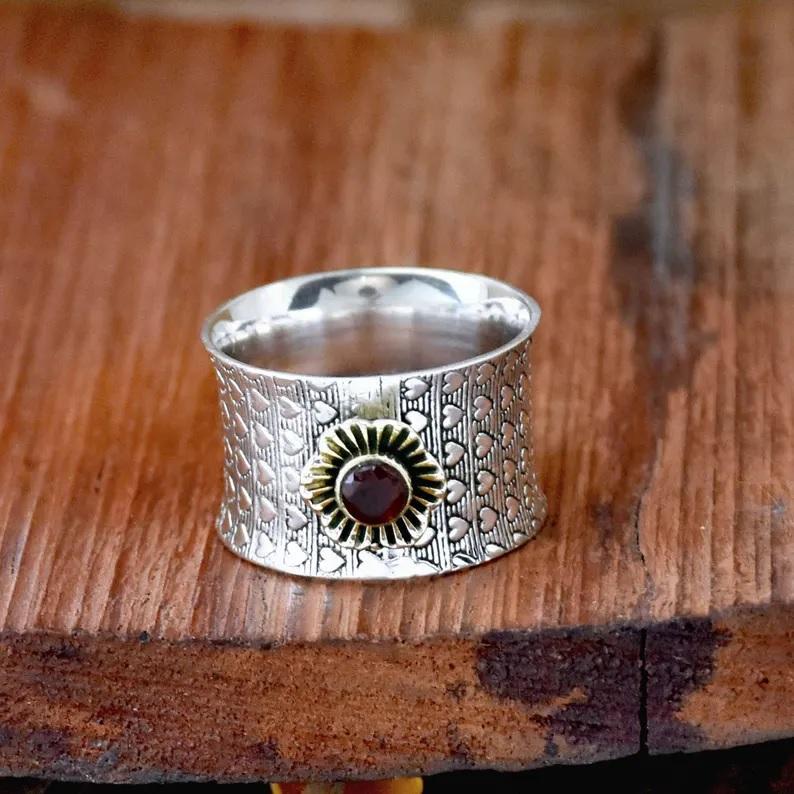 Red Garnet Ring 925 Sterling Silver Wide Band Heart Stamped Flower Statement Wedding Band Ring Gift for Her