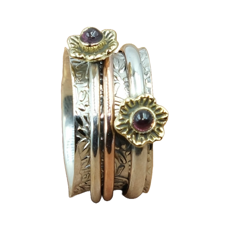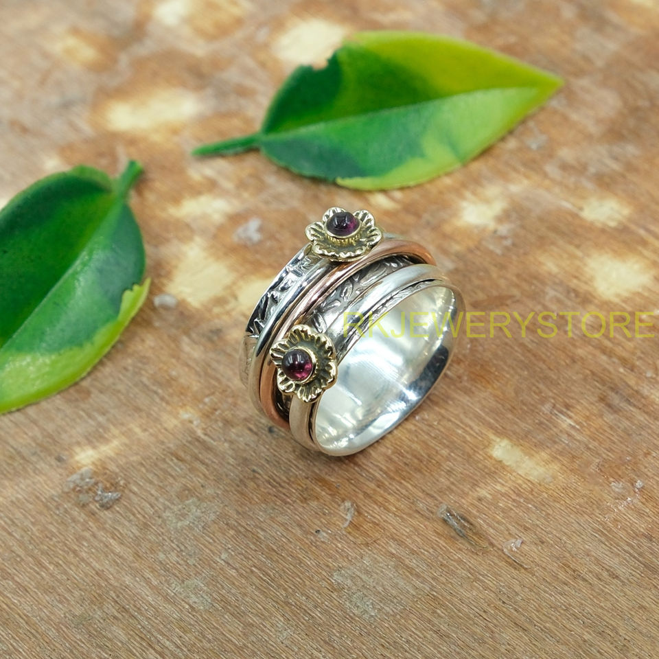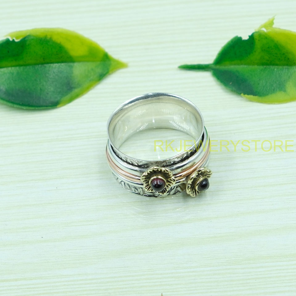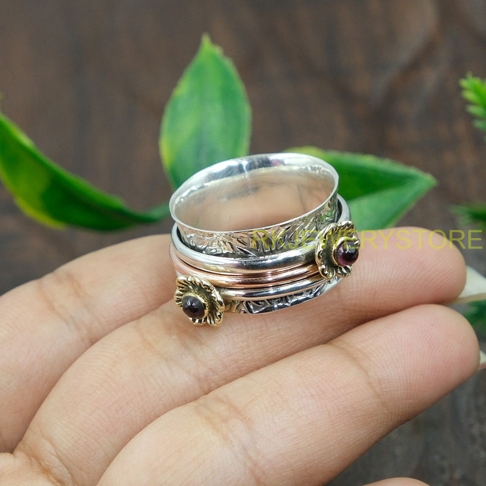 Red Garnet Spinner Ring Anxiety Thumb Ring Pure 925 Sterling Silver Spinner Ring Hammered Ring With Brass And Copper Jewelry