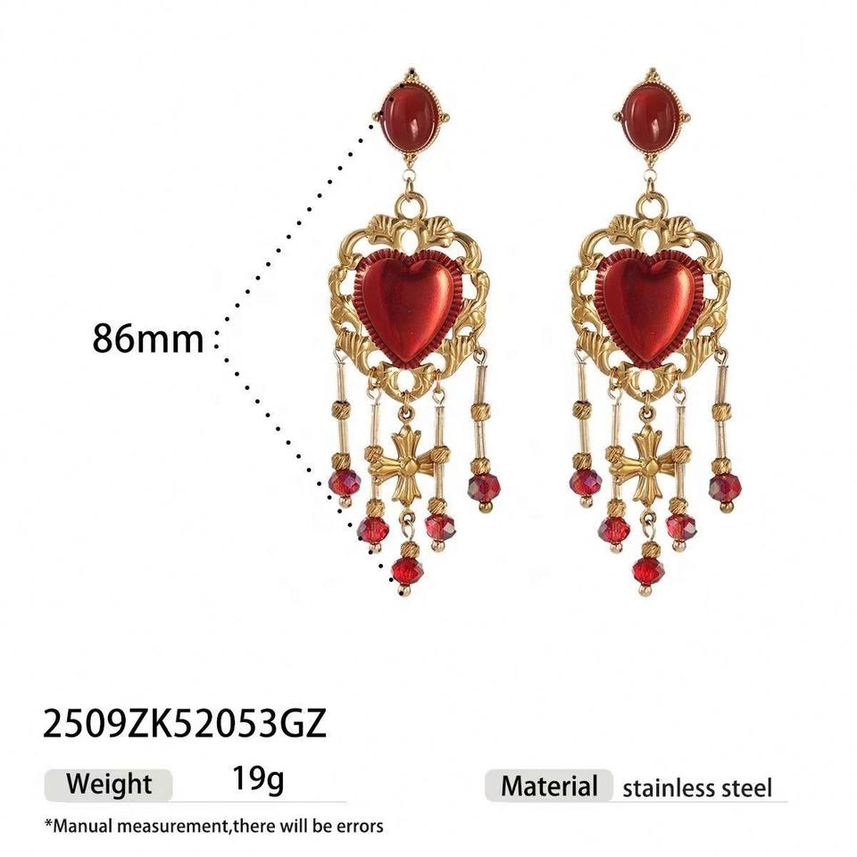 Red Heart Necklace Earrings Set 18K Gold Plated Stainless Steel Tassel Cross Pendant Non-Tarnish Jewelry for Women Wedding Party
