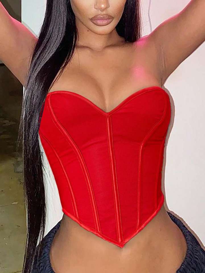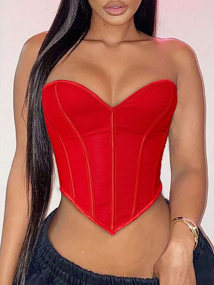 Red Heart Neckline Strapless Corset Shapewear Top for Women, Outerwear Sexy Hot Girl Tight Waist Cincher Top