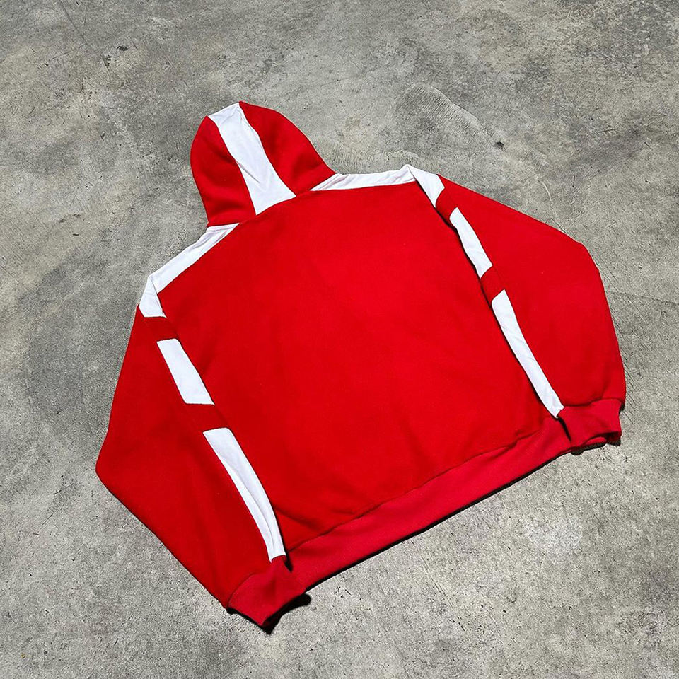 Red Hoodie With White Side Strip Patch Work Oversized Boxy Fitted Trendy Style Embroidery Color Block