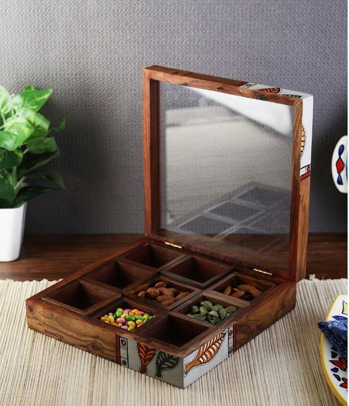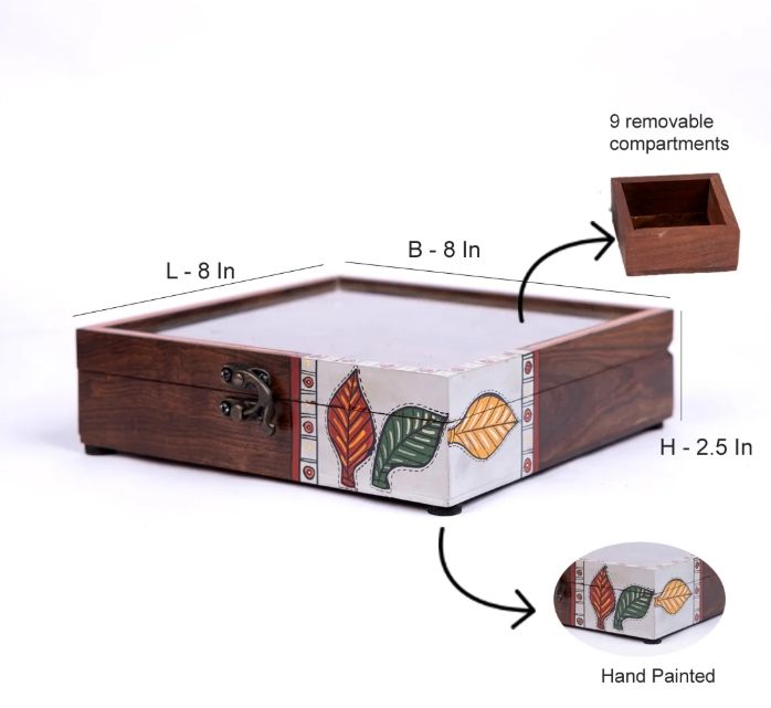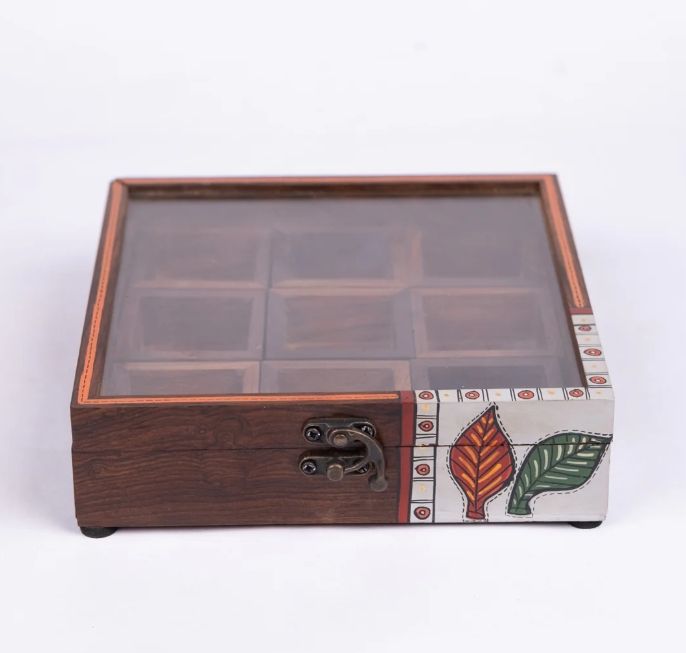 Red Leaf Mango Wood Spice Box with 9 Partitions Containers spice container with spoon wooden kitchen decor Removable Compartment