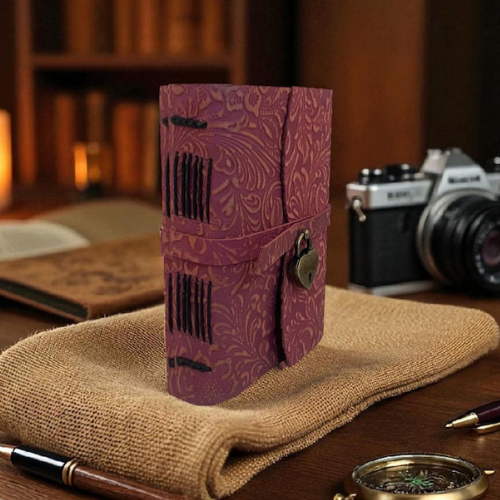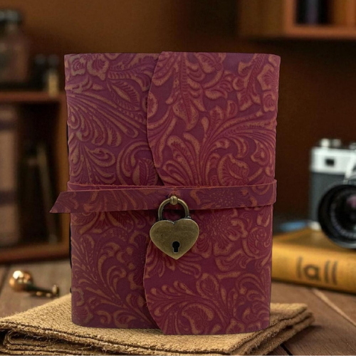 Red Leather Journal & Heart Lock Personalized Flower Embossed Notebook
