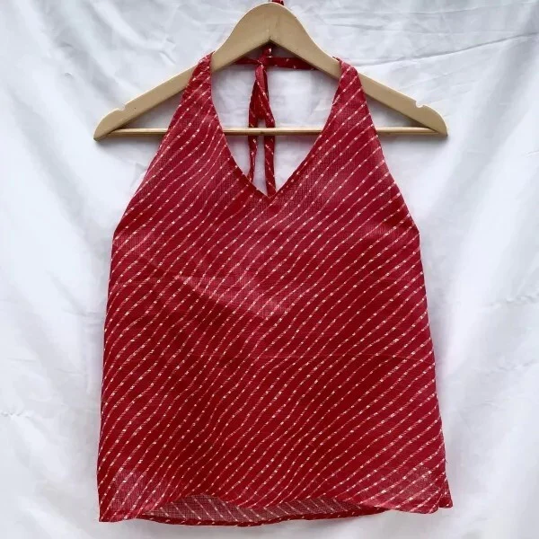 Red Lehariya Halter Neck Top Short Length Knitted Kota Doria Featuring Hollow out Casual Daily Wear Top For Women