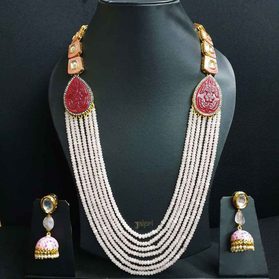 Red Meenakari & Kundan Pearl Beads Stone Necklace Set with Earrings Fine Jewelry