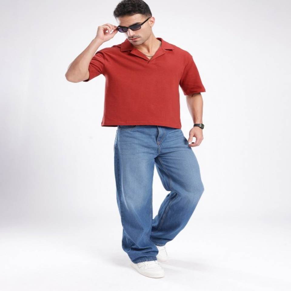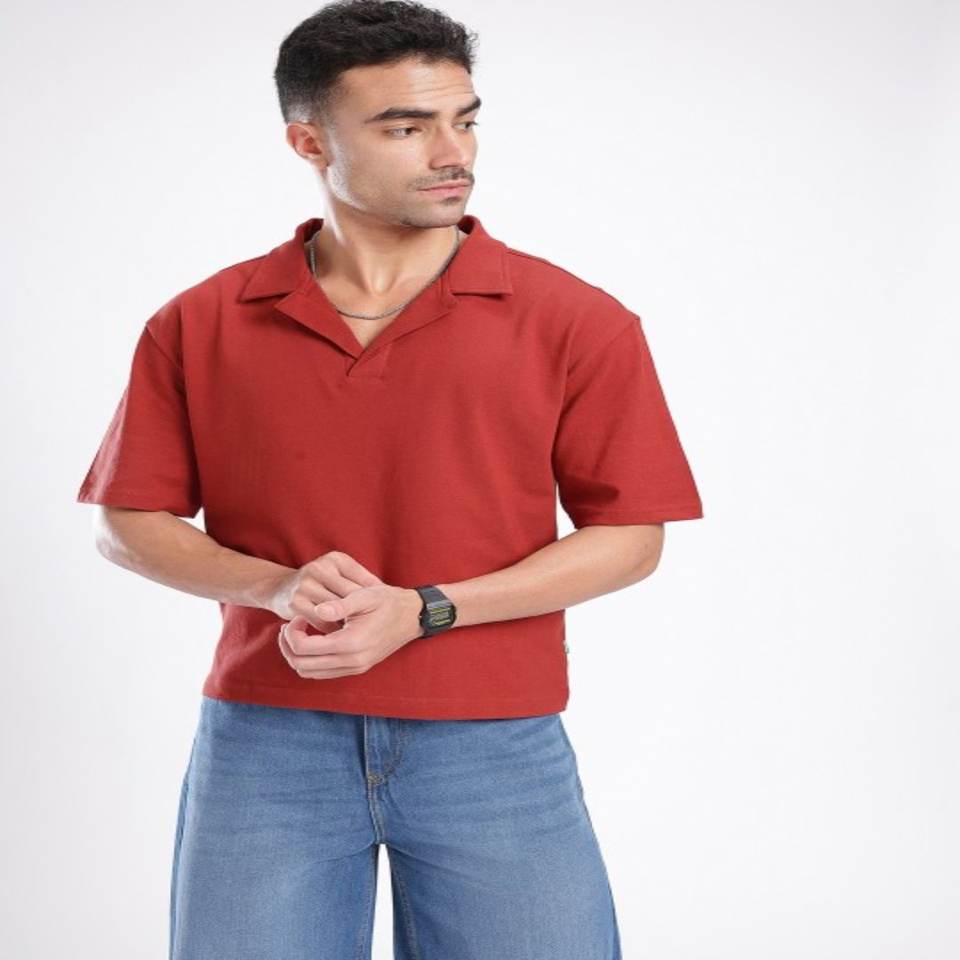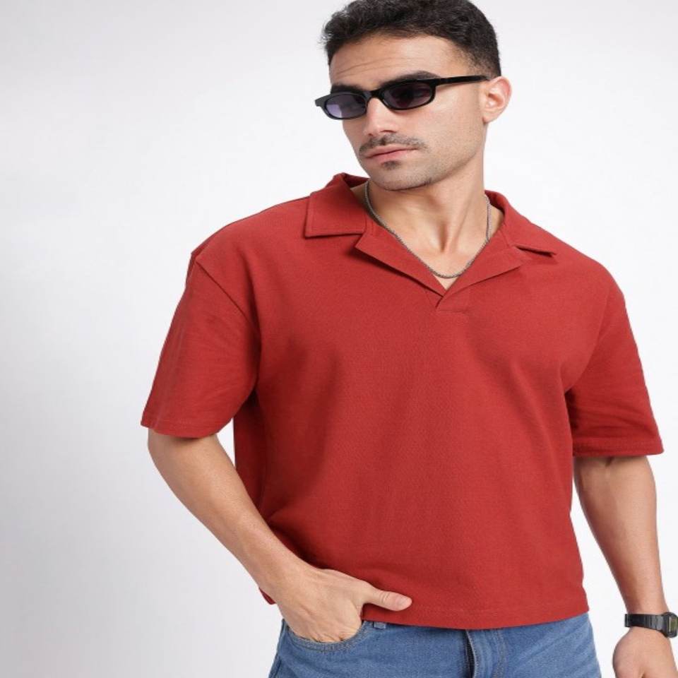 Red Polo Collar 100% Cotton Machine wash Oversized T-shirt for men Striped Regular length Polo collar Short sleeves t-shirt