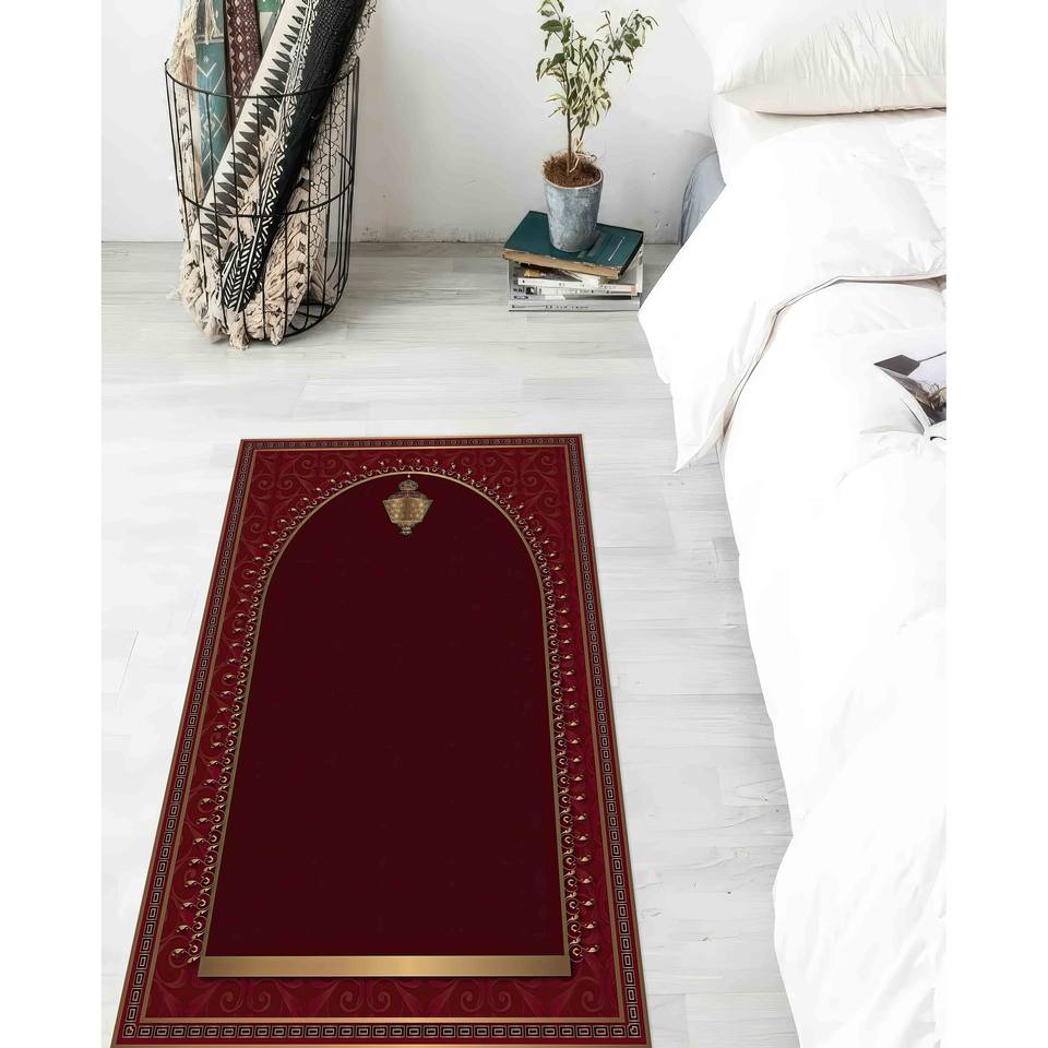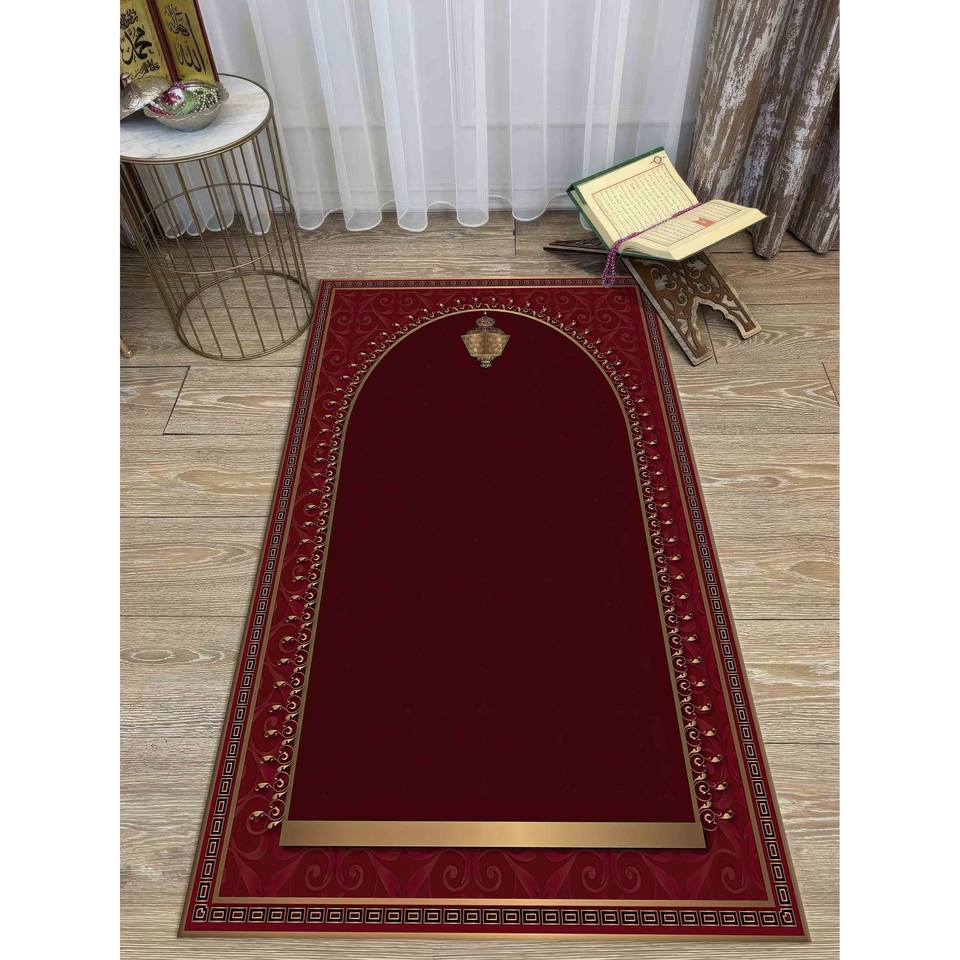 Red Prayer Rug: Elegant Gold Islamic Decor, Worship Rug, Printed Rug,With Pile Soft Rug