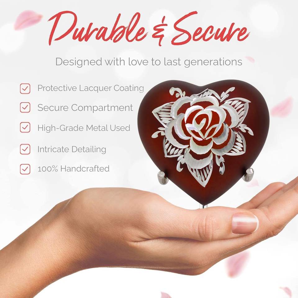 Red Rose Heart Urn - Small Keepsake for Human Ashes with Stand & Box - Mini Red Urn - Honor Your Loved One with a Small