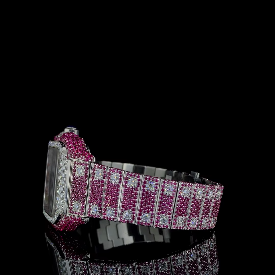 Red Ruby White Moissanite Diamond Full Iced Square Antique Quartz Glass Stainless Steel White Plated Roman Indices Watch Perfect