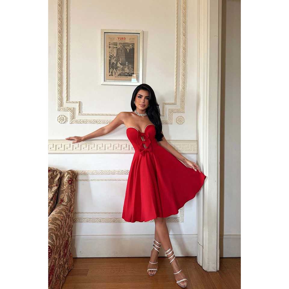 Red Satin Strapless Ball Gown with Bow Detail Sequins Luxury Formal Evening Party Dress Size XL Floor-Length A-Line Sheath