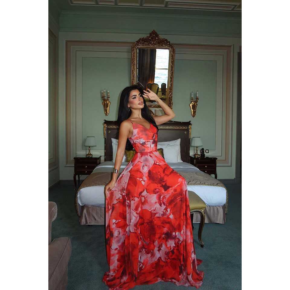 Red Sisu Long Evening Dress Ball Gown Style with Sequins and Pearls Empire Waistline Formal Party Gown-Size XS