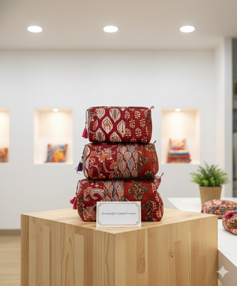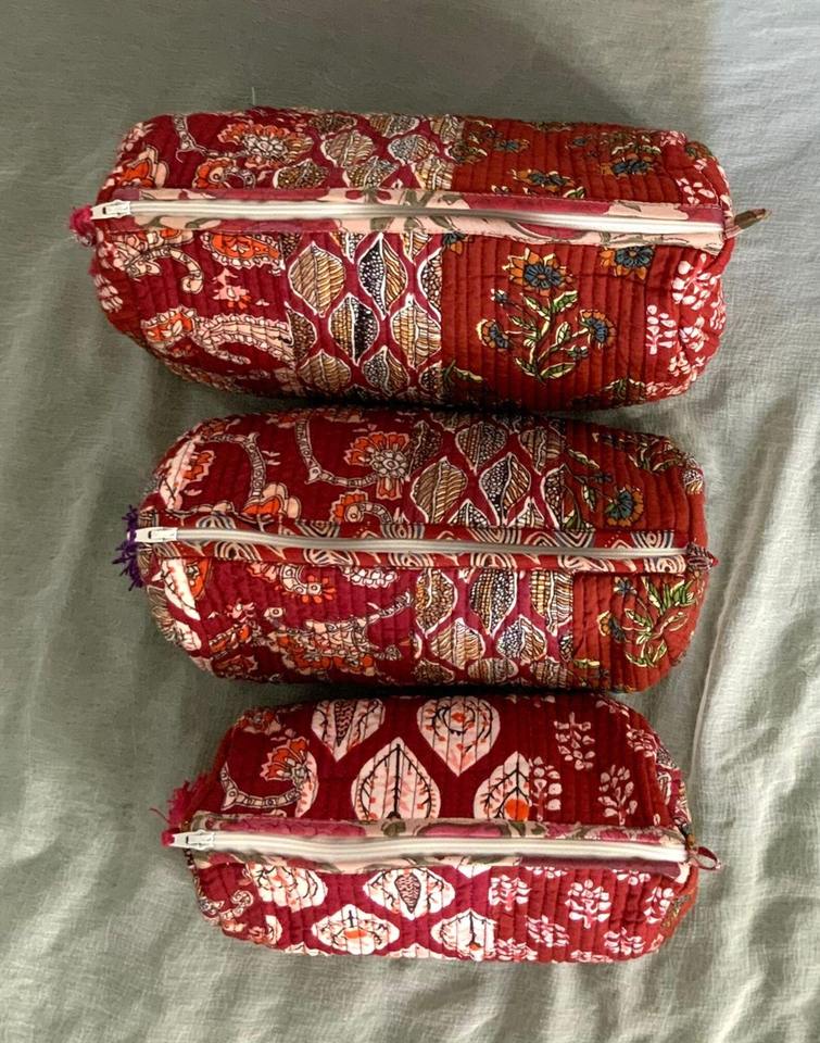 Red Vintage Cotton Eco-Friendly Water Resistant 3-Piece Quilted Zipper Cosmetic Case Set Travel Makeup Storage Gift
