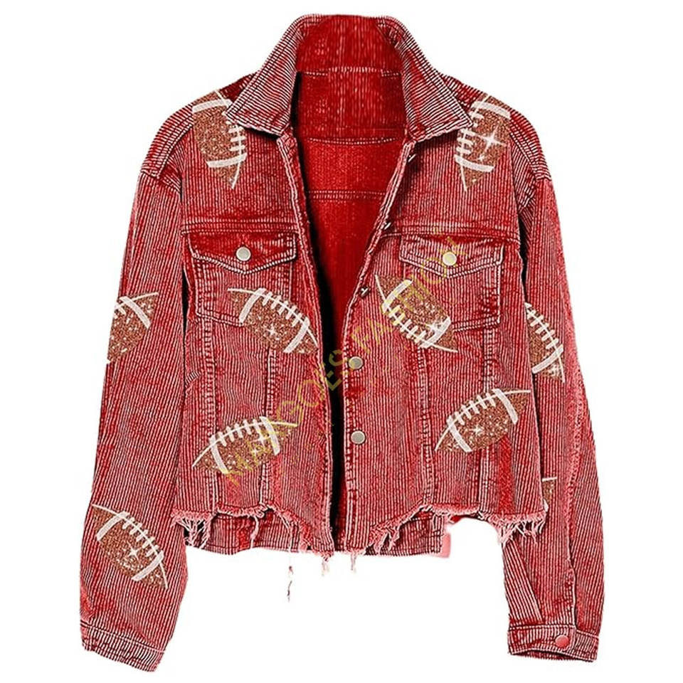 Red Womens Corduroy Sequin Jacket - Cropped Rugby Patched Shacket Coat with Distressed Finish For Sequin Jackets