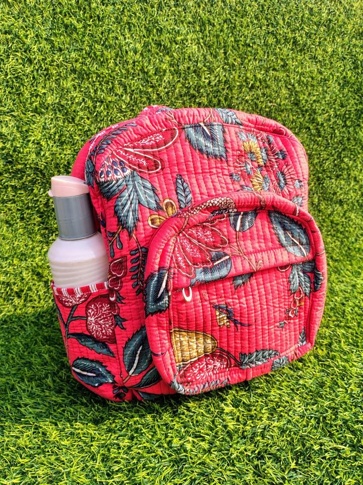 Red Zipper Closure Backpack Handmade Unisex Quilted Cotton Floral Printed Mini School Bag For School Students Wholesale