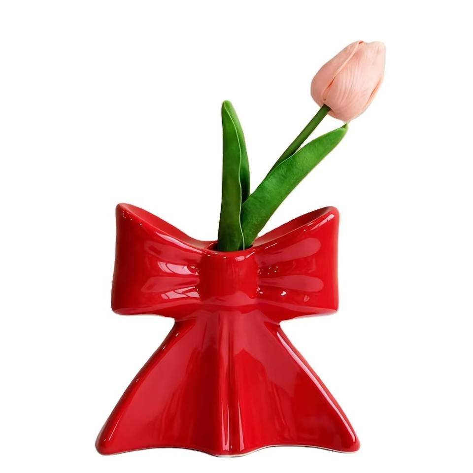 Red Glazed Bowknot Ceramic Flower Vase Handmade Mid Century Modern Design Elevates Shelves Countertops Understated