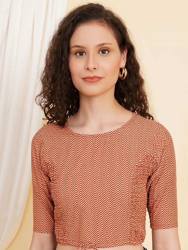 Red cotton zig zag printed blouse with a round neck and short sleeves designed for a relaxed regular fit in l xl size daily wear