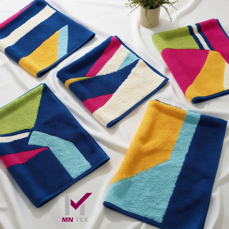 Quick-Dry, Anti pilling treated, 100% Cotton, Premium Cotton, Multi color, Super Absorbent, Geometric, Zero Twist Towels, For All Ages, 450 to 650 Gsm, Set Contains 2 wash cloth +1 hand towel + 2 bath tfeature