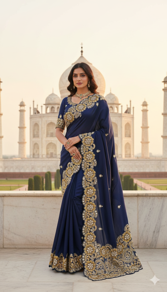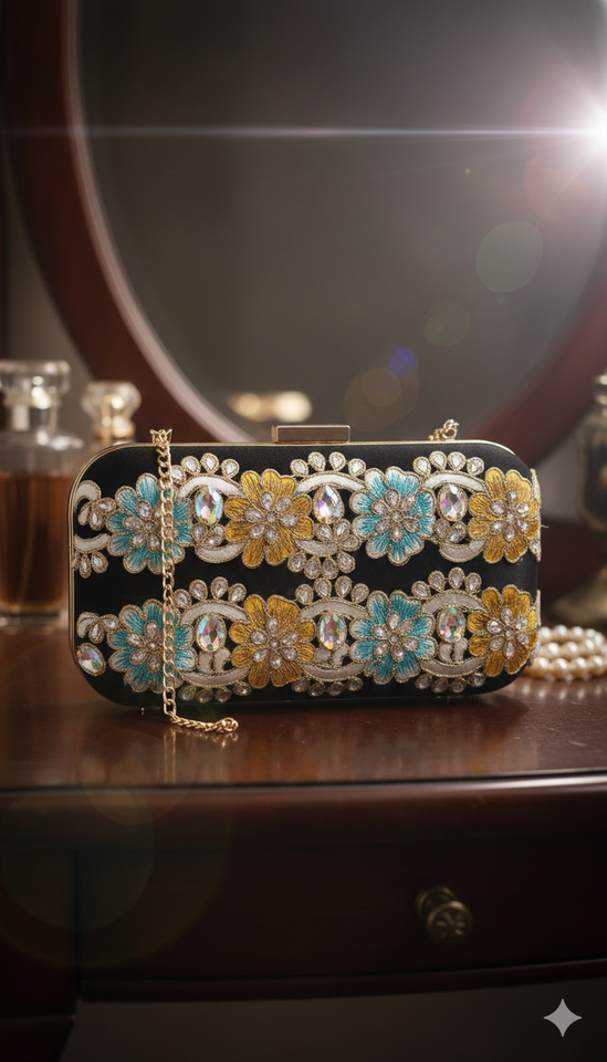 Regal Crystal Embellished Embroidery work Floral Applique Lace Trim Gold and Aqua Duo