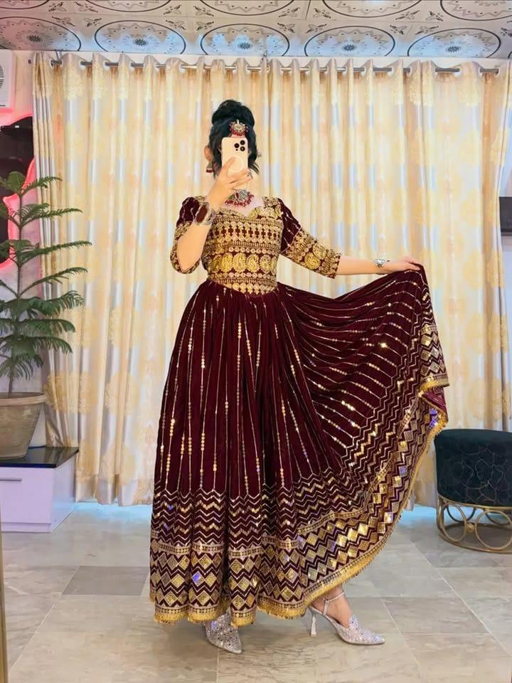 Regal Maroon Velvet Embroidered Traditional Festive Dress With Golden Handwork And Matching Dupatta Styled
