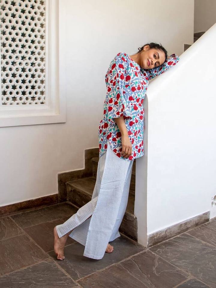 Regular Fit Breathable Cotton Fabric Pink Fruits Hand Block Printed Top Stripes Lightweight Full Pajama for Summer Natural