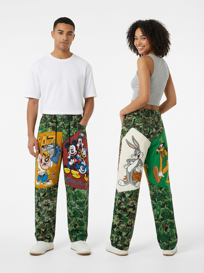 Regular Fitted Unisex Graphic Print Patchwork Denim Pants Wide Leg Streetwear Cartoon Style Casual Fashion Denim Trousers Women