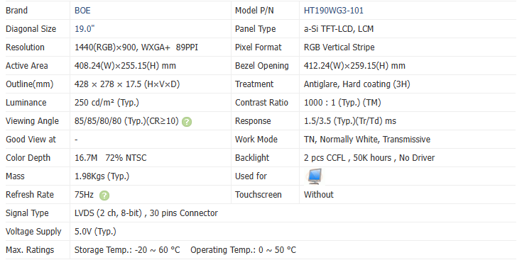 Light Source:2 pcs CCFL , 50K hours , Without Driver