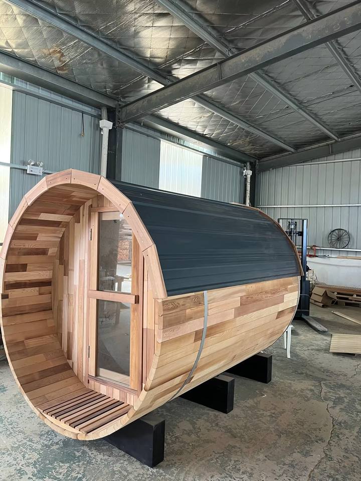 Reliable Reputation Luxury Red Cedar Wood Traditional Large Outdoor Barrel Sauna Bathroom Room With Porch And Etl Heater