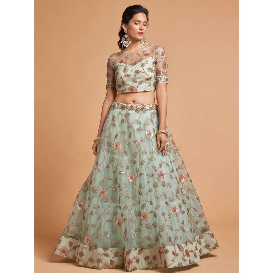 Impressive Pista Green Thread Net Evening Dress Lehenga Choli for Party Wear