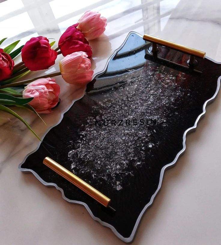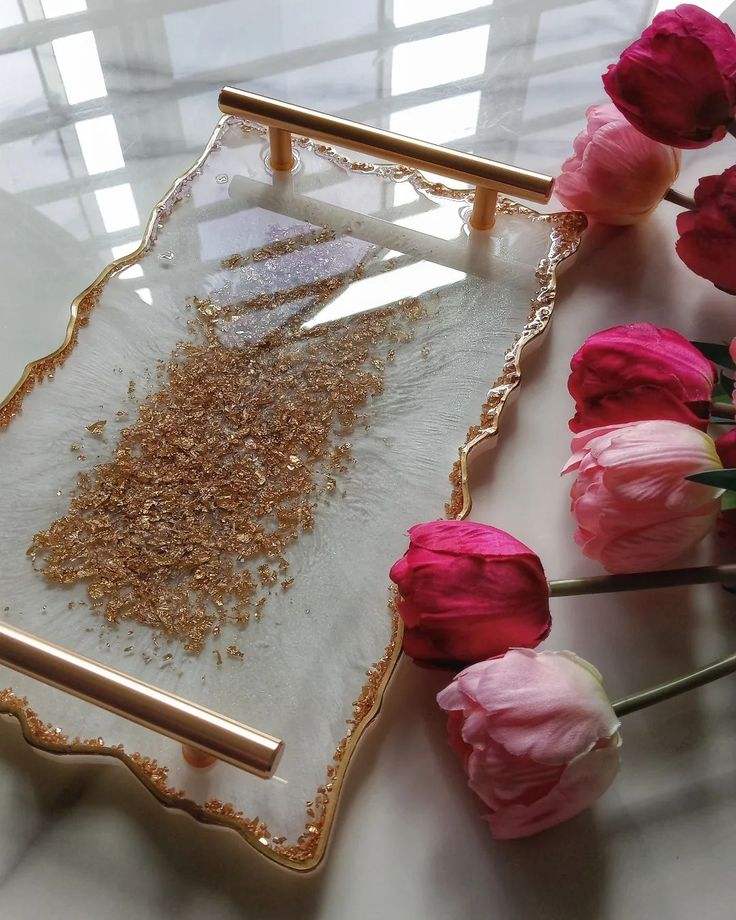 Resin tray with golden metal handle perfect for luxury wedding party table centerpiece serving drinks snacks