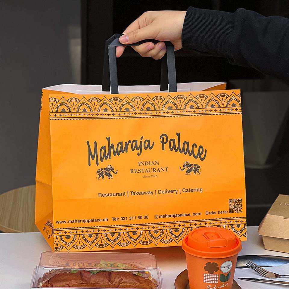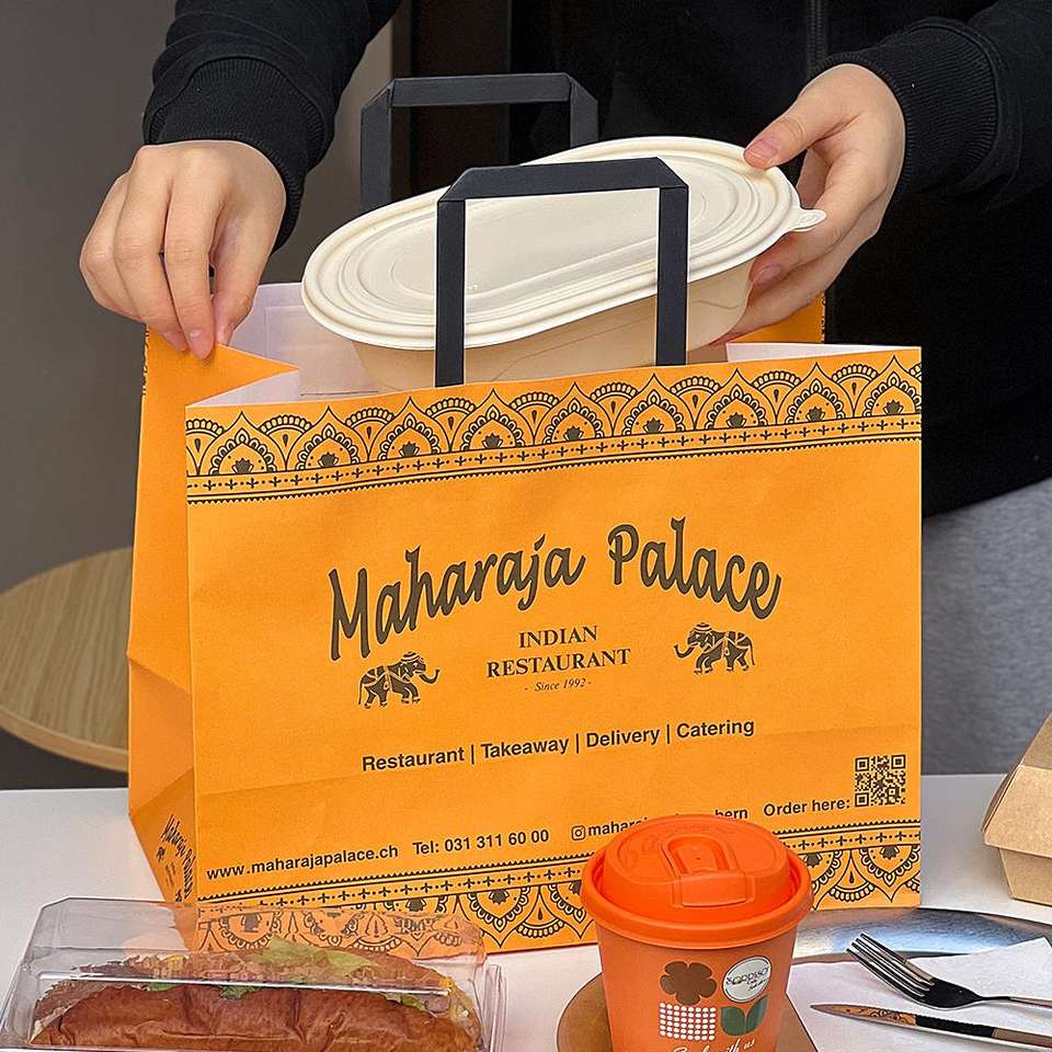 Restaurant Catering Food Takeaway to Go Biodegradable Eco-Friendly Packaging Custom Logo Kraft Brown Paper Bag with Handles