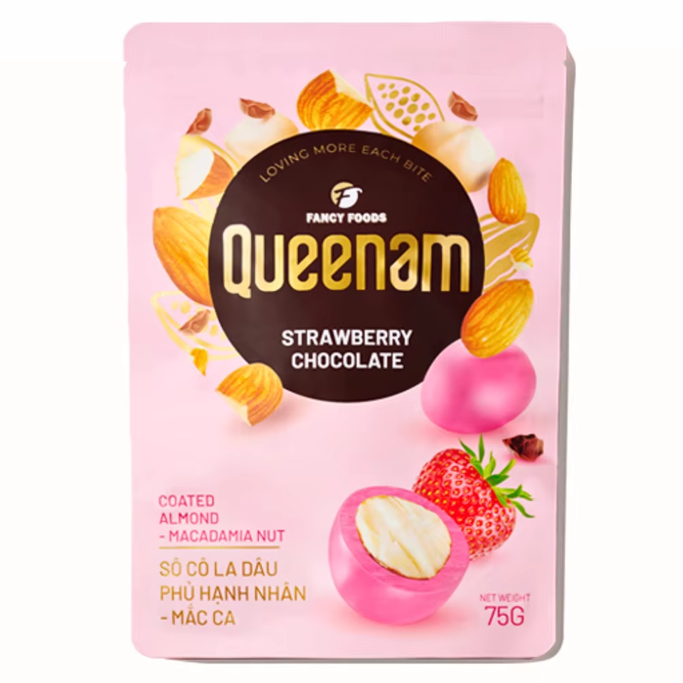 Queenam Retailing Manufacturing Bulk Wholesale Dragee Chocolate OEM/ODM HALAL 75G Strawberry Chocolate Coated Almond Macadamia