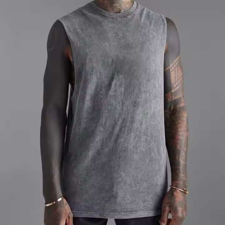 Retro Acid Washed Sleeve Less Tshirt Summer DTG Printing Loose Sleeveless Tank Tops Men Tee Shirt