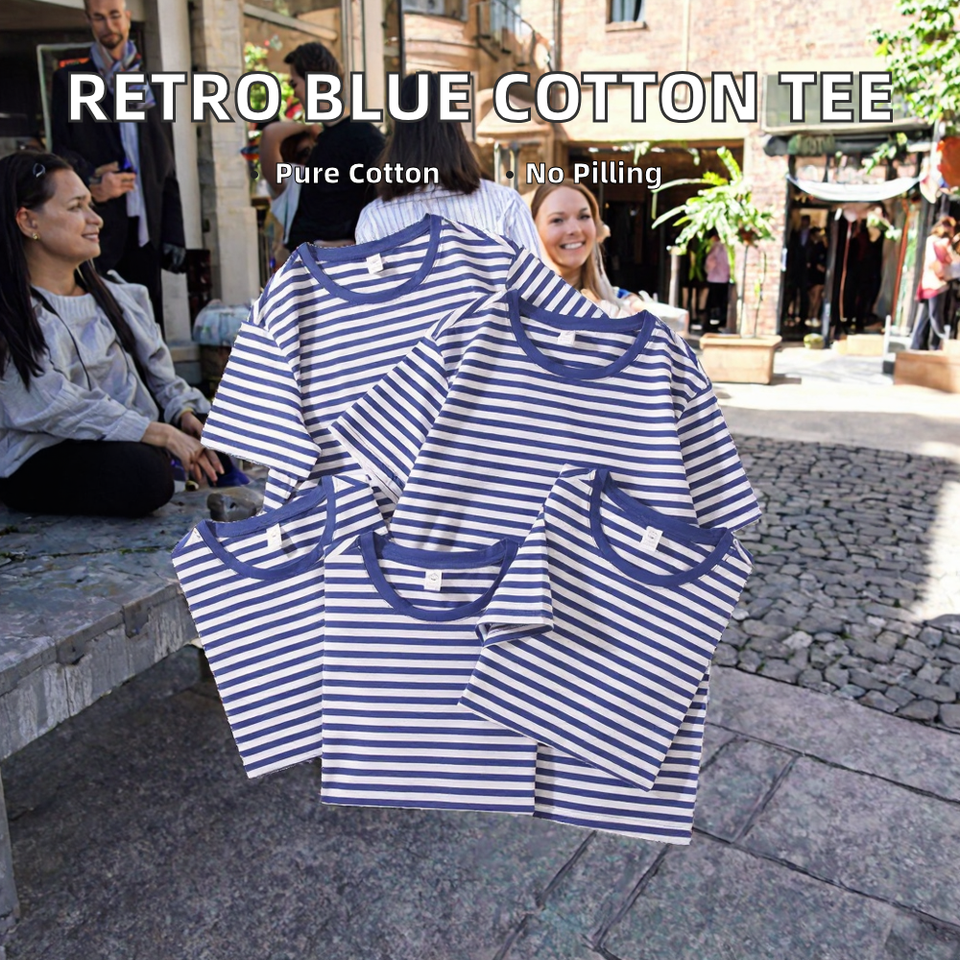 Retro Blue & White Striped 100% Cotton T-Shirt Loose Fit Short Sleeve Crew Neck 180g Knitted Fabric with Pattern