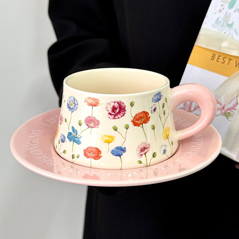 Retro Coffee Cups and Saucers pink Coffee Cups, Retro Style Ceramic Coffee Mug with Saucer