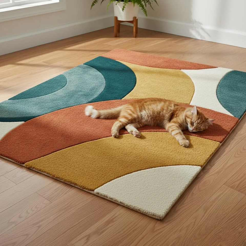 Retro Color Block Tufted Area Rug | Mid Century Modern Abstract Geometric Living Room Carpet | Handmade Wool Boho Teppich