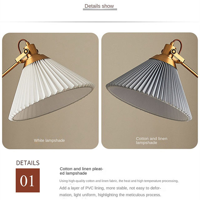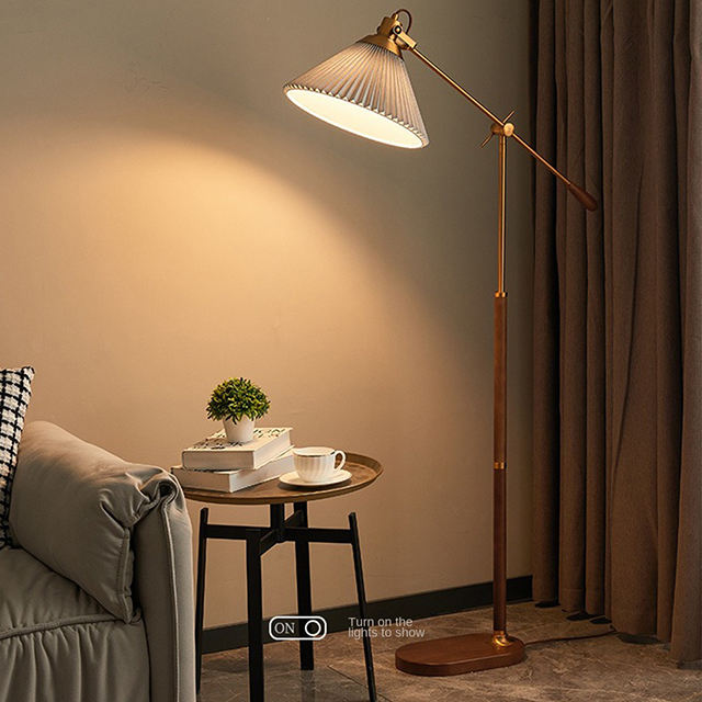 Retro Cream Pleated Fabric Lampshade Wooden Base Room Corner Decorative Adjustable Arm Metal Floor Standing Lamp