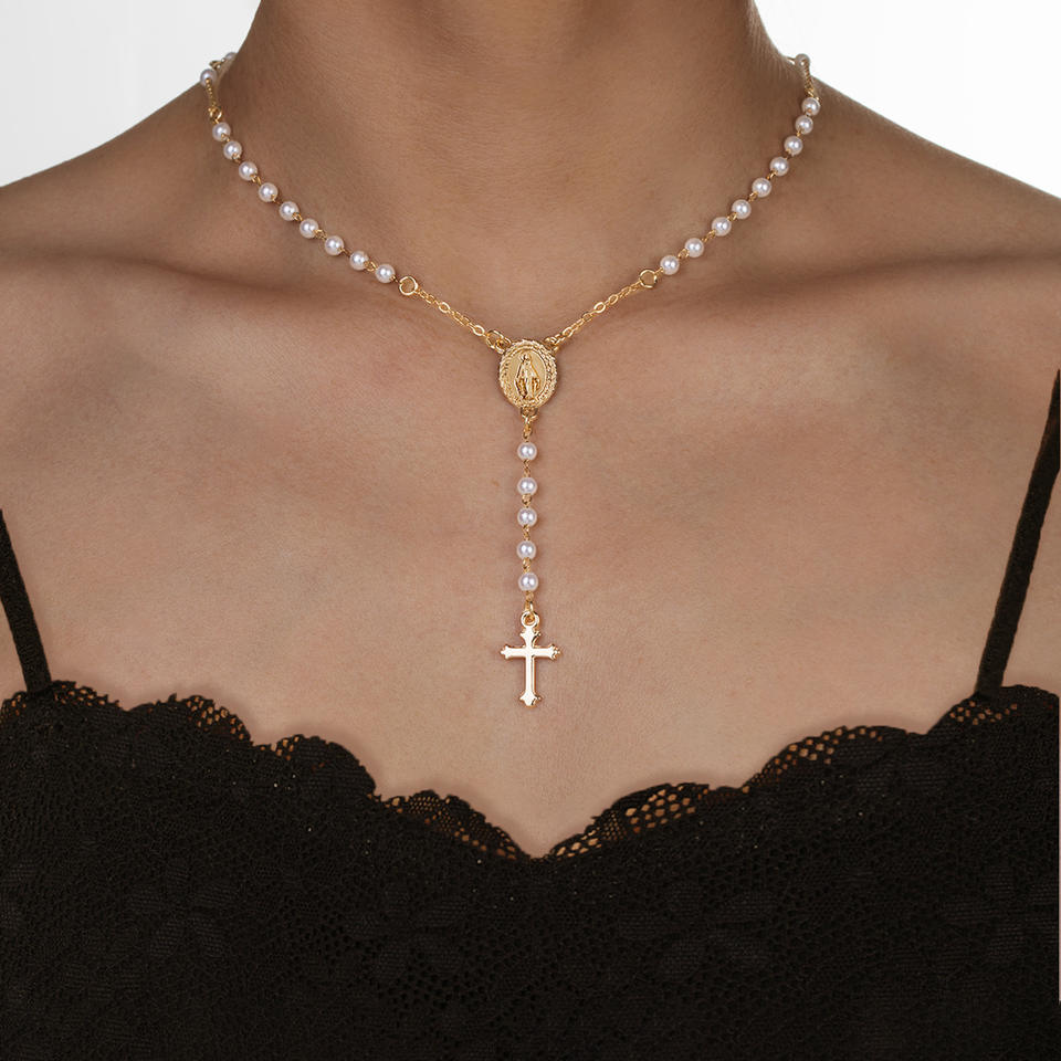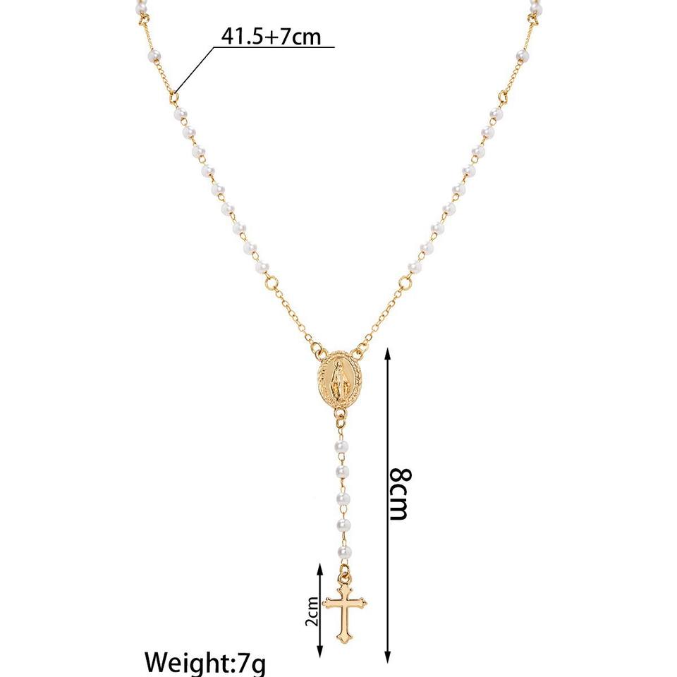 Retro Ethnic Style Alloy Cross Pendant Pearl Beaded Y-shaped Chain Adjustable Women's Necklace