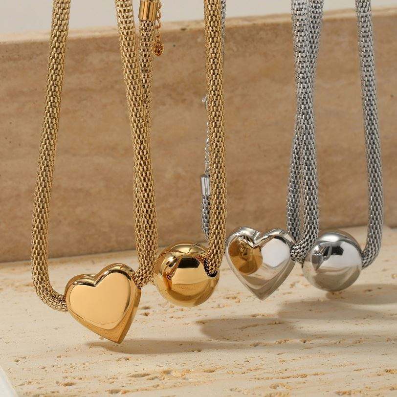 Retro Fashion Heart Metal Charm Chunky Stainless Steel Necklace Statement Chain Big Ball Pendant Gold Plated J