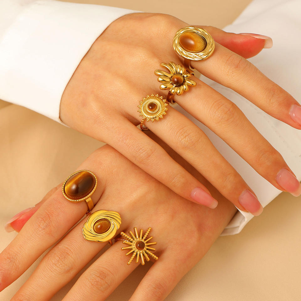 Retro French 18K gold stainless steel ring exaggerated tiger eye stone ring jewelry female