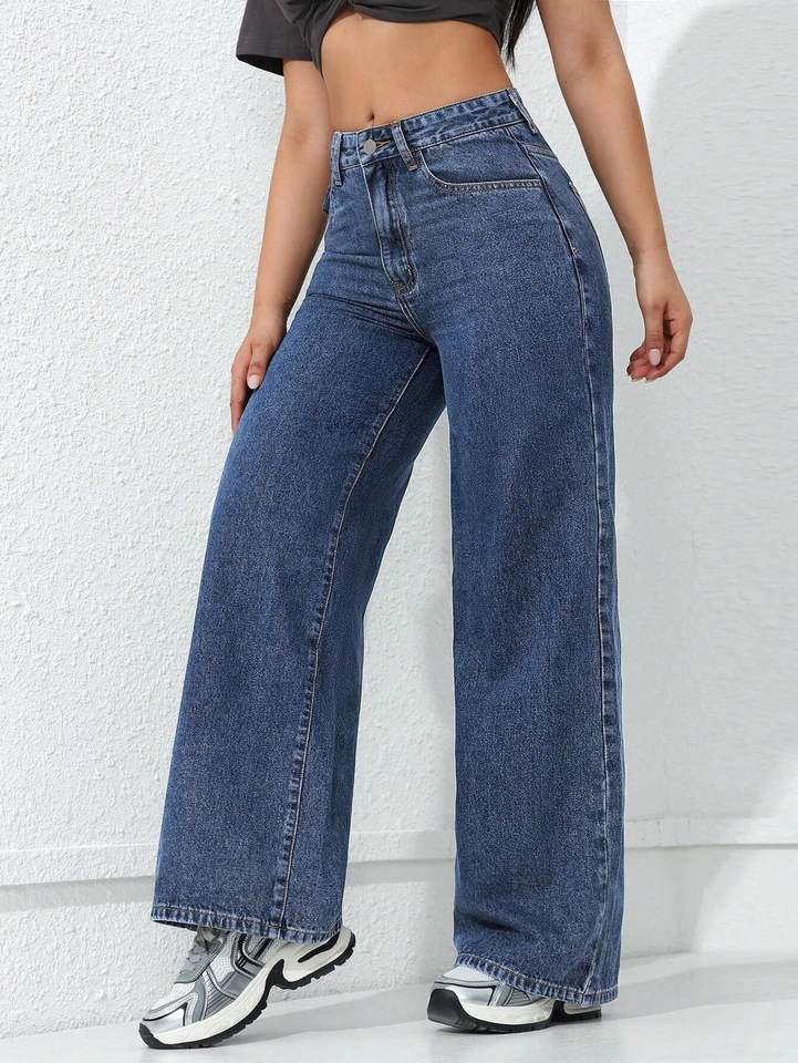 Retro Loose Wide Leg Jeans Fashion Women Solid Straight Wash High Elastic Waist Denim Pants Casual Streetwear Pocket Trousers