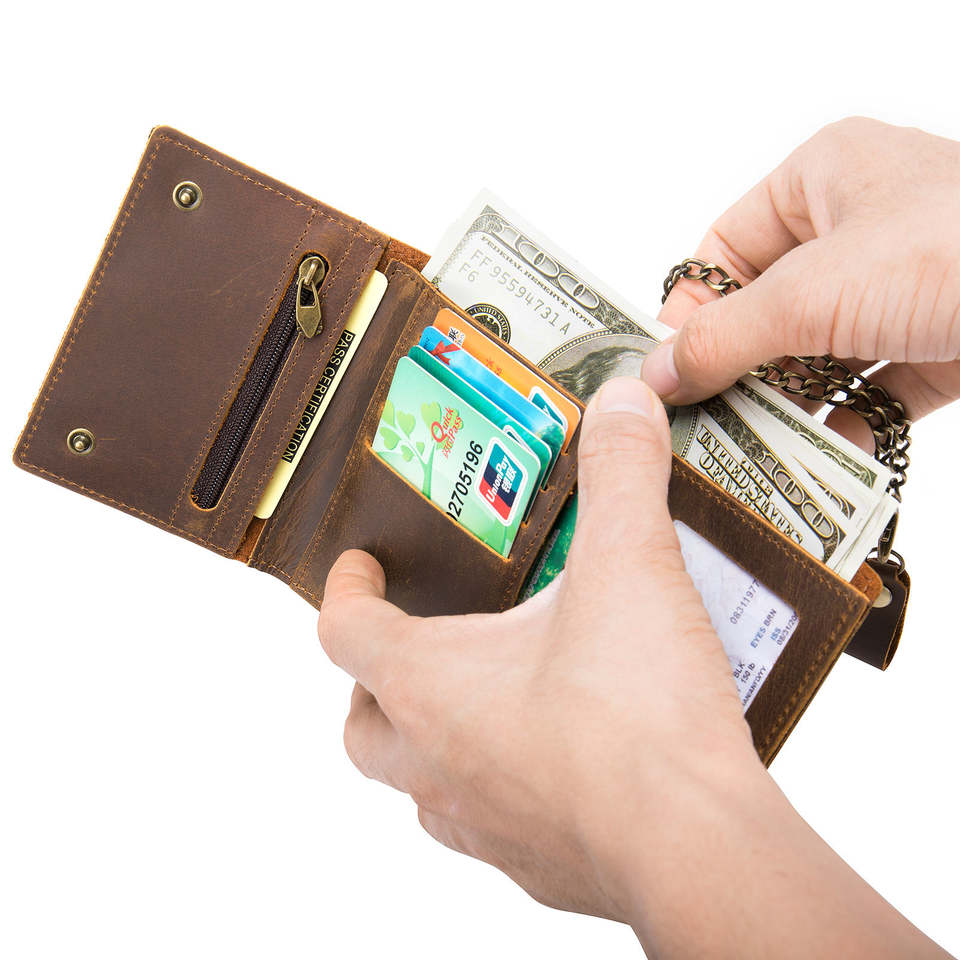 Men's Retro Genuine Leather Slim Wallet with RFID Blocking Zipper Pocket and Chain Vintage Style Card Holder